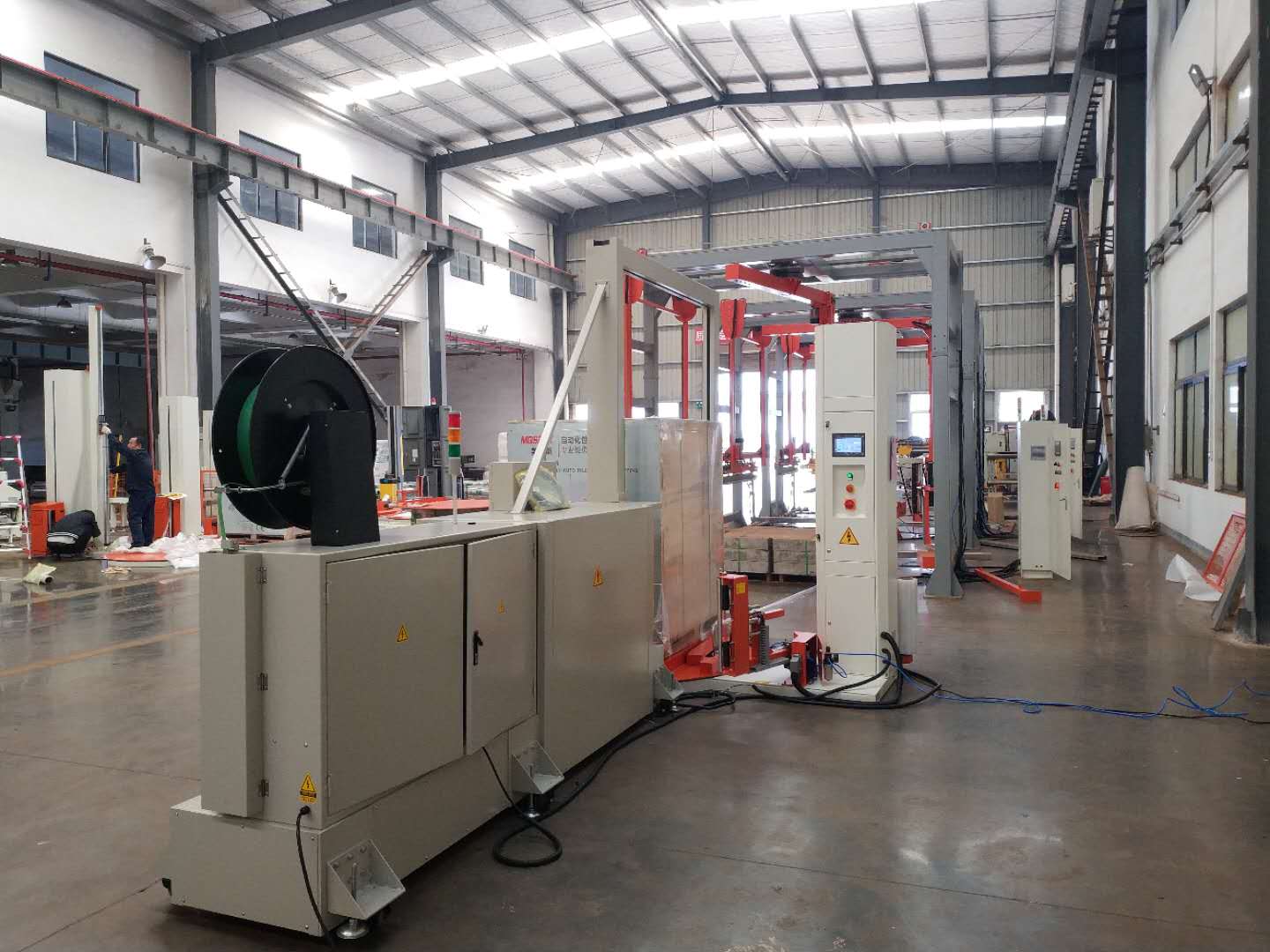 將托盤貨物放到纏繞機圓盤上后,按啟動鍵進(jìn)行全自動打包(縱橫2條行程井字形,共計4條)打包好后進(jìn)行托盤纏繞,自動纏繞包裝好后會有報警提示音人工用叉車下貨入庫完成整個流程。