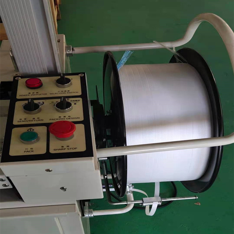 6、拿著打包帶的頭就從底部裝線,再到上面,打包帶的頭推進打包機的入口處